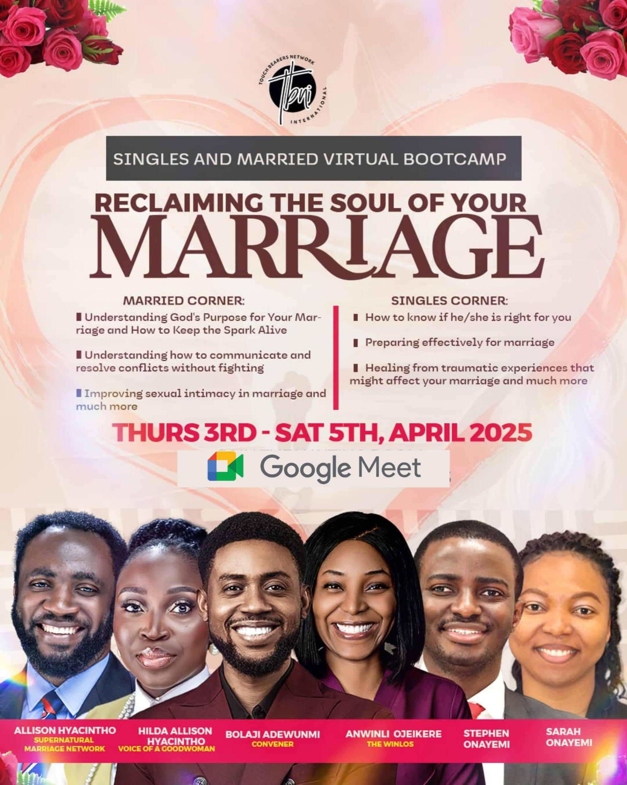 We are thrilled to confirm that you have successfully secured your spot in our SINGLES AND MARRIED VIRTUAL BOOTCAMP